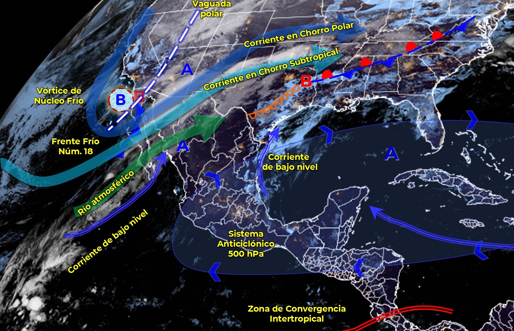 México.- Este día, el Frente Frío Número 18, su masa de aire asociada, una vaguada polar, un vórtice de núcleo frío y el ingreso de humedad proveniente de un río atmosférico, ocasionarán lluvias intensas (de 75 a 150 milímetros [mm]) en Chihuahua, Sinaloa y Sonora; muy fuertes (de 50 a 75 mm) en Durango; fuertes (de 25 a 50 mm) en Baja California y Baja California Sur; lluvias aisladas (de 0.1 a 5 mm) en Coahuila; descenso de temperatura en el noroeste y norte de México, y condiciones para la caída de aguanieve o nieve en sierras de Baja California, Chihuahua, Durango y Sonora.