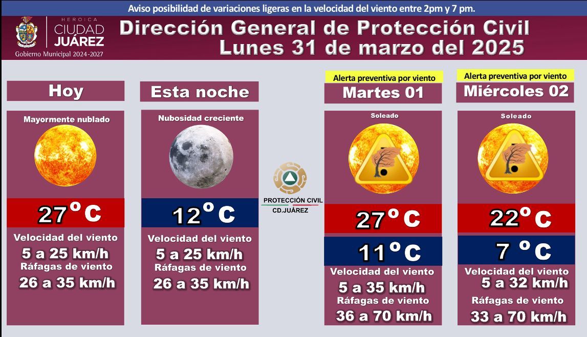 Juárez.- La Dirección General de Protección Civil informa sobre las condiciones meteorológicas para los próximos días, destacando una alerta preventiva por fuertes vientos.