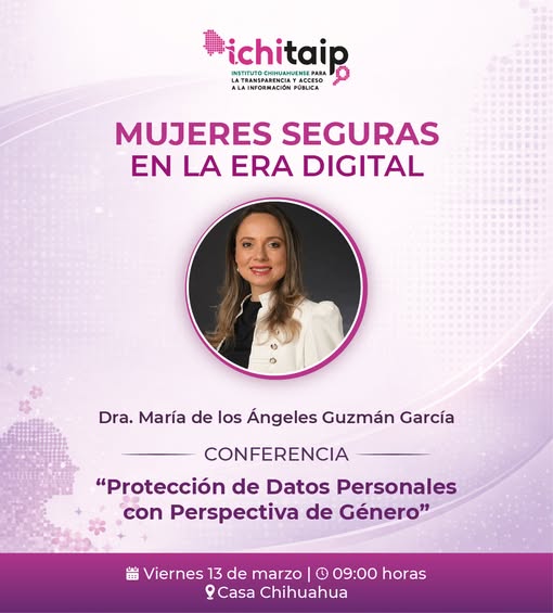 Chihuahua.- El Instituto Chihuahuense para la Transparencia y Acceso a la Información Pública (ICHITAIP), en el marco de la conmemoración del 8 de marzo Día Internacional de la Mujer, invita al público en general a la conferencia Mujeres Seguras en la era Digital “Protección de Datos Personales con Perspectiva de Género”, que se realizará el próximo viernes 13 a las 9:00 horas en el museo Casa Chihuahua.