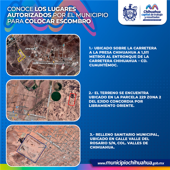 Chihuahua.- El Gobierno Municipal de Chihuahua, a través de la Dirección de Desarrollo Urbano y Ecología, da a conocer a la ciudadanía los lugares autorizados para el depósito de escombro, con el fin de evitar sanciones por colocar los desechos en la vía pública o lugares no autorizados, de acuerdo Reglamento de Protección al Medio Ambiente y Cambio Climático del Municipio de Chihuahua.