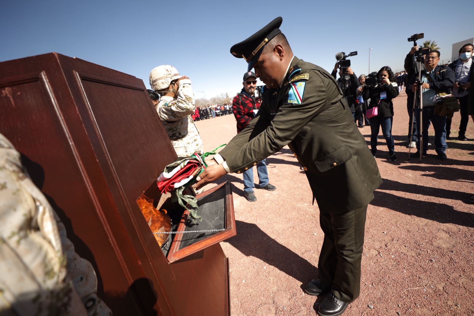 Juárez.- En el marco del Día de la Bandera, el Presidente Municipal, Cruz Pérez Cuéllar, encabezó la ceremonia de incineración y abanderamiento de escoltas de diferentes centros educativos.