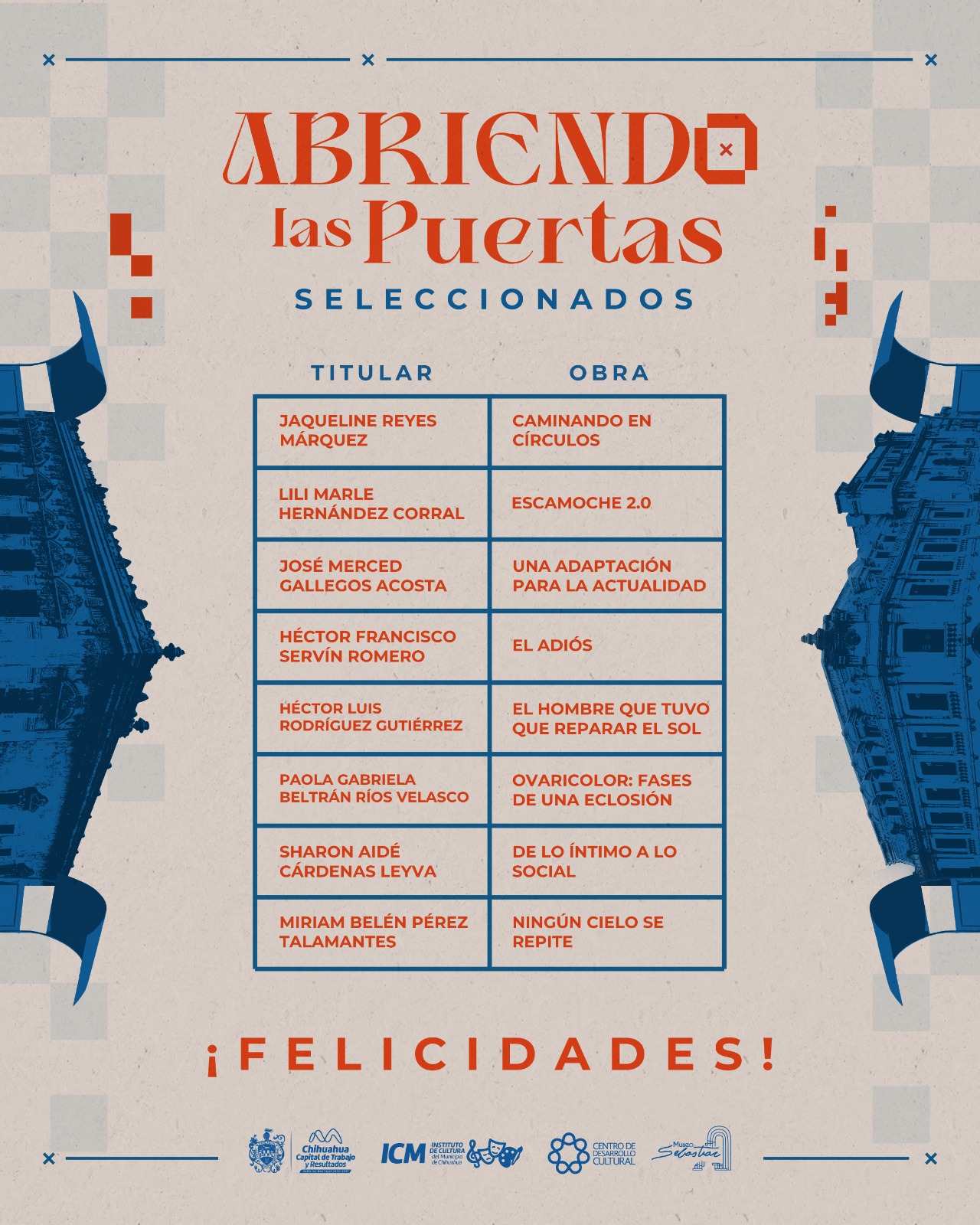 Chihuahua, Chih.- El Gobierno Municipal de Chihuahua, a través del Instituto de Cultura del Municipio, informa los resultados de la convocatoria “Abriendo las Puertas”, cuyo periodo de registro concluyó el pasado 2 de febrero de 2026.