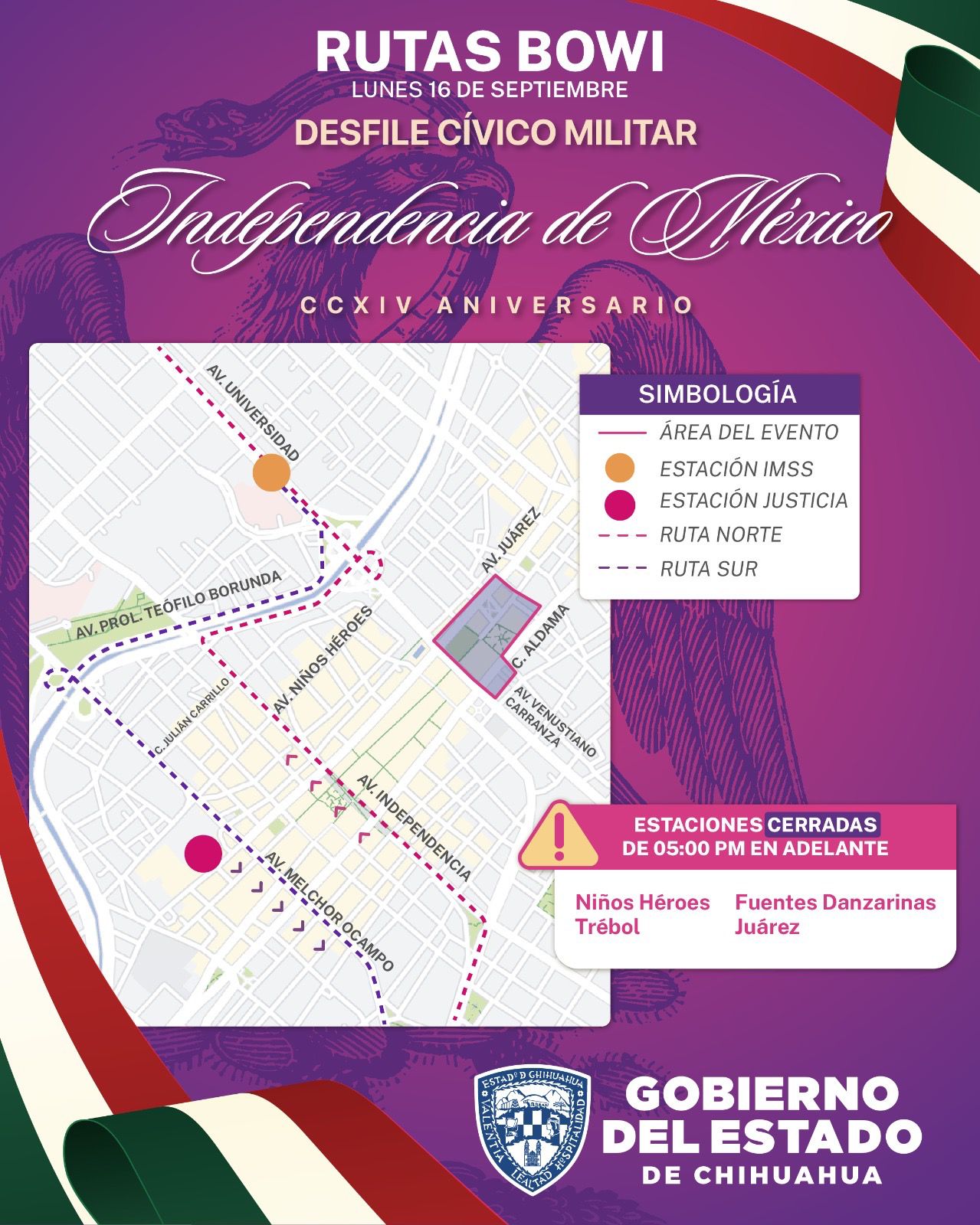 Chihuahua, Chih.- La Secretaría General de Gobierno, a través de la Operadora de Transporte (OTV), informa que, con motivo del desfile cívico conmemorativo del Aniversario del Inicio del Movimiento Independencia de México este 16 de septiembre, la ruta de Bowí tendrá una desviación a partir de las 9:00 a.m. y hasta terminar el evento.