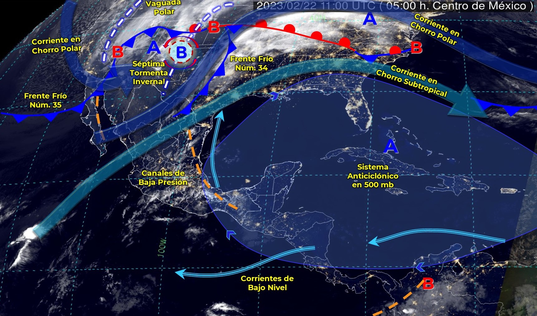 En cuanto al frente frío #34 y la 7ª tormenta invernal de la temporada se desplazaron sobre Texas y dejaron de afectar paulatinamente al territorio chihuahuense, sin embargo, aún originarán rachas de viento muy fuertes a intensas con tolvaneras sobre estados de la Mesa del Norte.