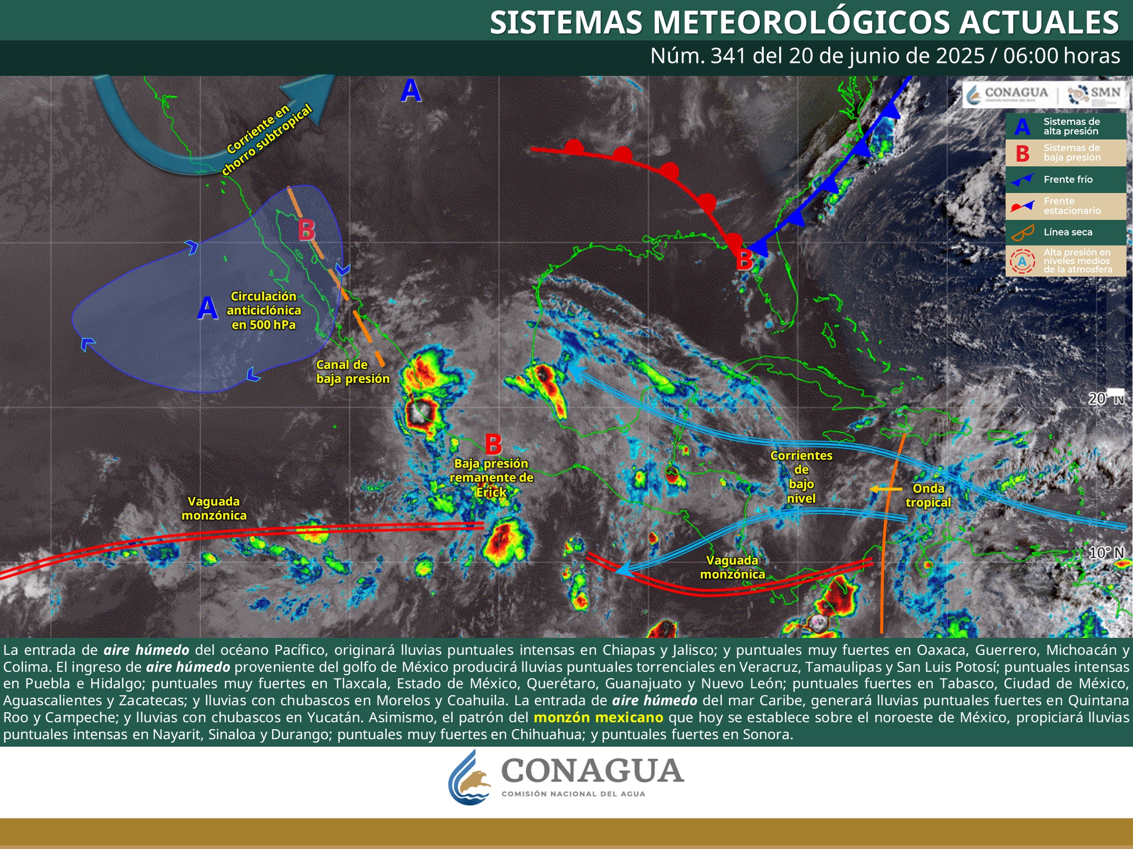 Por su parte, el Servicio Meteorológico Nacional (SMN) informó que el patrón de monzón mexicano hoy se establecerá sobre el noroeste del país y propiciará lluvias puntuales muy fuertes en el estado de Chihuahua, esto es una acumulación de 50 a 70 milímetros en caso de registrarse.