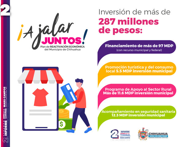 Con la intención de contrarrestar el cierre de negocios provocado por la contingencia sanitaria del COVID-19, surgida en este segundo año de esta administración 2018-2021, la alcaldesa Maru Campos propuso la creación del Plan de Reactivación Económica “A jalar juntos”, iniciativa en la que participaron más de 50 organismos de diferentes sectores y que comprende una inversión de más de 287 millones de pesos.