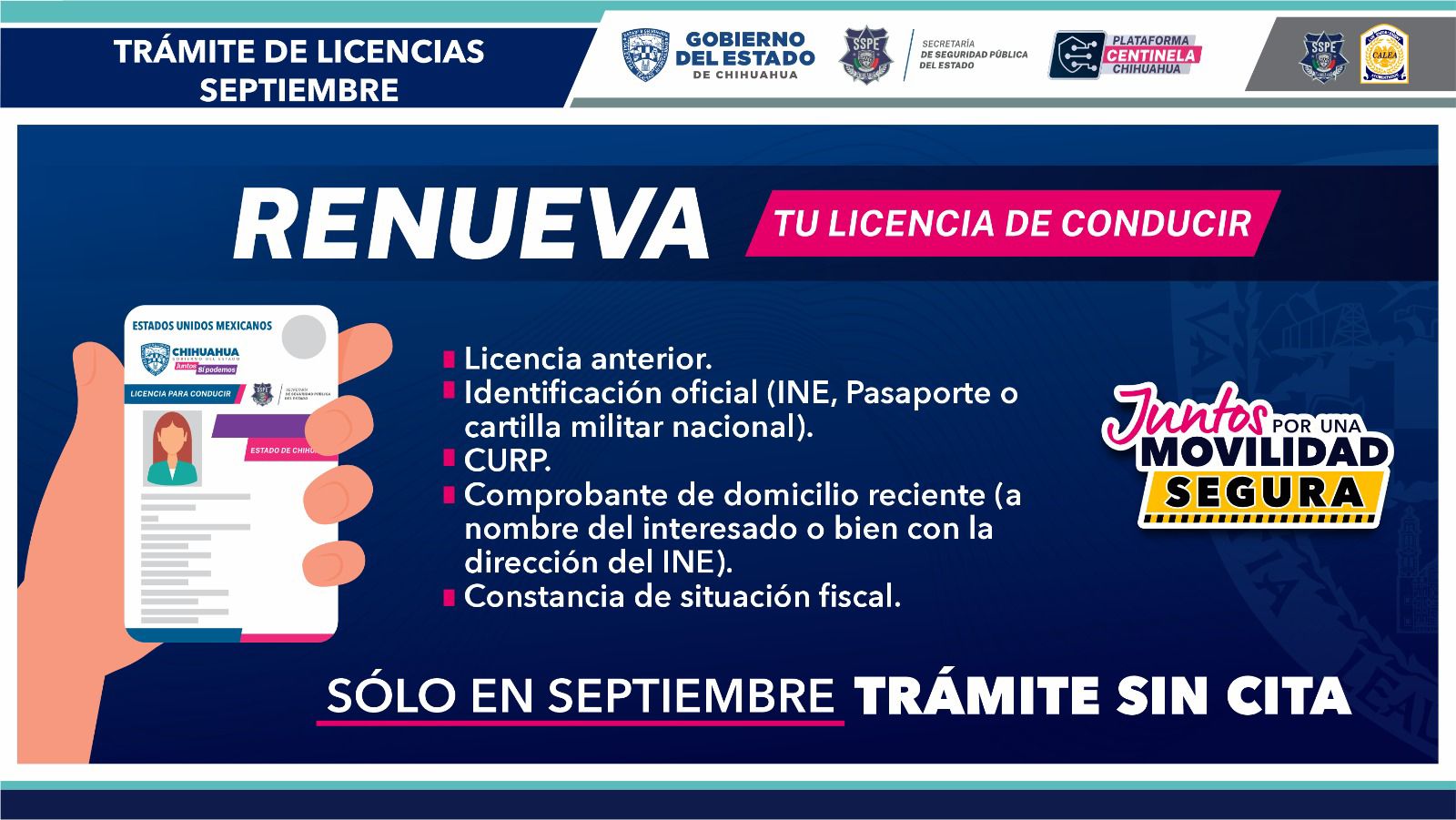 Chihuahua.- En el marco del regreso a clases, la Secretaría de Seguridad Pública del Estado (SSPE), a través de la Subsecretaría de Movilidad, invita a la ciudadanía a acudir durante el mes de septiembre a renovar la licencia de conducir sin previa cita.