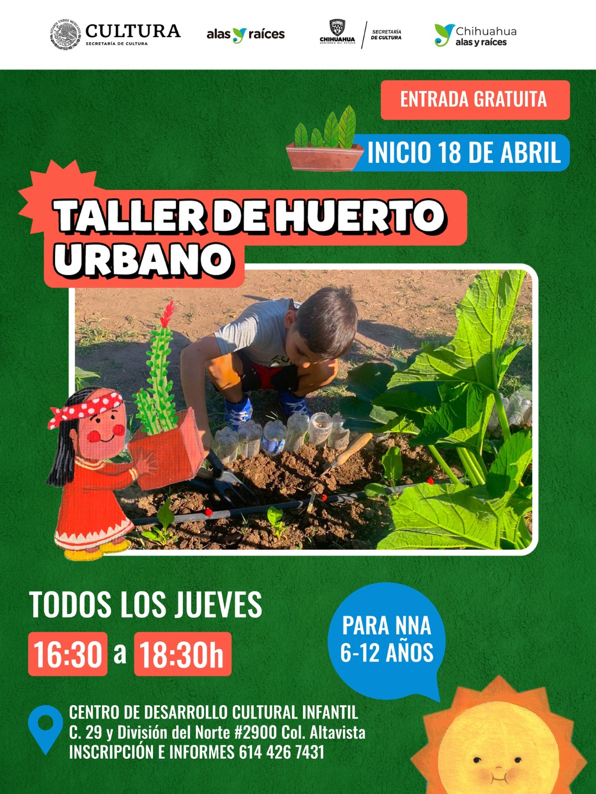Chihuahua.- El Departamento de Desarrollo Comunitario y Públicos Específicos de la Secretaría de Cultura, invita a niñas y niños a participar en el taller infantil de Huerto Urbano Ecológico, que se realizará todos los jueves a partir del 18 de abril, de las 16:30 a las 18:30 horas, con registro previo.