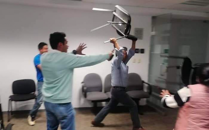 Ante los reclamos, el alcalde lanzó golpes y sillazos a los presentes, lo cual fue capto en fotografías que más tarde circularon en redes sociales.