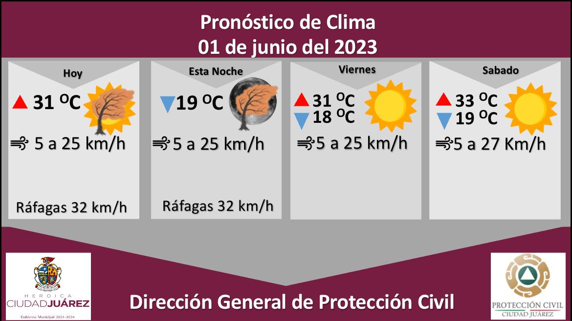 Juárez.- La Dirección General de Protección Civil, con base en informes del Servicio Meteorológico Nacional, pronostica fuertes ráfagas de viento de hasta 32 kilómetros por hora para este jueves, informó Roberto Briones Mota, titular de la dependencia.