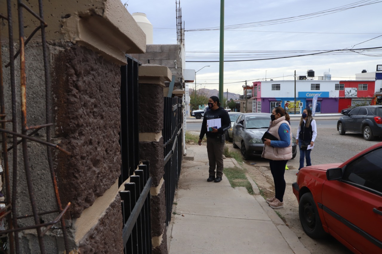 Chihuahua.- El Gobierno Municipal, a través de la Dirección de Seguridad Pública, realizó el recorrido “Tocando puertas contra la violencia”, en la colonia Riberas de Sacramento, a fin de brindar orientación de manera directa a las familias chihuahuenses, sobre la importancia de la denuncia y la manera de pedir ayuda cuando existan situaciones de violencia familiar dentro de los hogares.