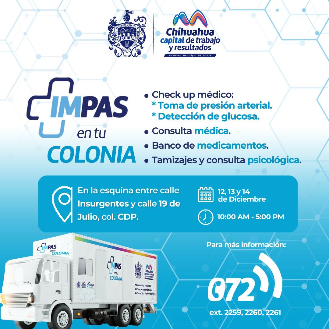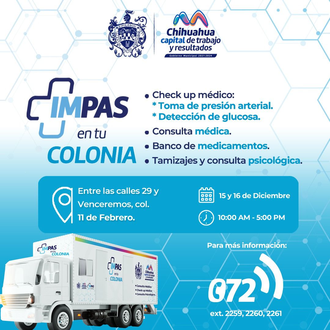 El Gobierno Municipal, a través del Instituto Municipal de Prevención y Atención a la Salud (IMPAS), acercará los servicios de salud para las y los chihuahuenses por medio del Consultorio Móvil con el programa “IMPAS en Tu Colonia” a las colonias 11 de Febrero y CDP del 12 al 16 de diciembre de 10:00 de la mañana a 5:00 de la tarde.