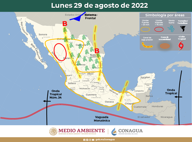 El monzón mexicano se mantendrá sobre el noroeste del país y originará lluvias muy fuertes a puntuales intensas con posibles granizadas en Sonora, Chihuahua, Durango y Sinaloa, así como chubascos en Baja California Sur. La interacción de dicho sistema con canales de baja presión, sobre la frontera norte de México y con inestabilidad en niveles altos de la atmósfera originarán también, chubascos y lluvias puntuales fuertes en zonas del norte y noreste del territorio mexicano. Un canal de baja presión se extenderá a lo largo de la Sierra Madre Occidental y el centro del país e interaccionará con la entrada de humedad de ambos litorales y con inestabilidad en niveles altos de la atmósfera, lo cual generará chubascos y lluvias puntuales muy fuertes en zonas del occidente, centro y sur del territorio mexicano. Además, otro canal de baja presión en el sureste de México, asociado con la entrada de humedad del Mar Caribe y Golfo de México, provocarán chubascos y lluvias puntuales fuertes en el oriente, sureste y la Península de Yucatán, asi como lluvias puntuales muy fuertes en Oaxaca y Chiapas. Las lluvias anteriormente mencionadas, estarán acompañadas de descargas eléctricas, rachas de viento y posible caída de granizo, además podrían incrementar los niveles de ríos y arroyos, y ocasionar deslaves e inundaciones en las entidades mencionadas. También, prevalecerá ambiente vespertino caluroso a muy caluroso en zonas del noroeste, norte y noreste de la República Mexicana, zonas del litoral del Océano Pacífico y la Península de Yucatán, con temperaturas que podrían superar los 40°C en Baja California y Sonora.