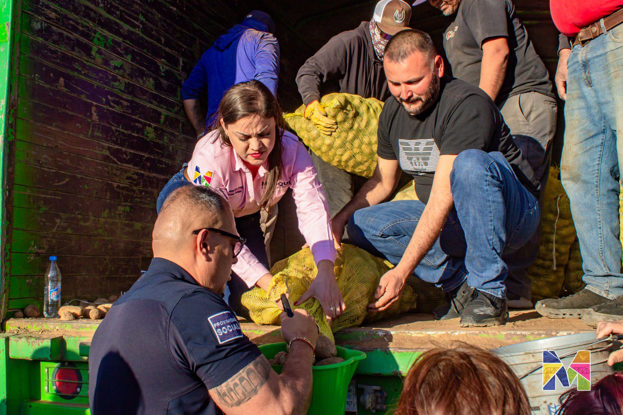 Meoqui.- En apoyo a la economía de las familias meoquenses, el Gobierno Municipal lleva a cabo un programa de apoyos alimentarios, beneficiando a más de 400 familias en la cabecera municipal en una primera entrega, encabezada por la alcaldesa Miriam Soto en el Parque de La Amistad, donde se distribuyeron 20 toneladas de papa sin costo alguno, además de ofrecer frijol y huevo a precios más accesibles que los del mercado, este programa contempla la entrega de 70 toneladas de papa en todo el municipio.