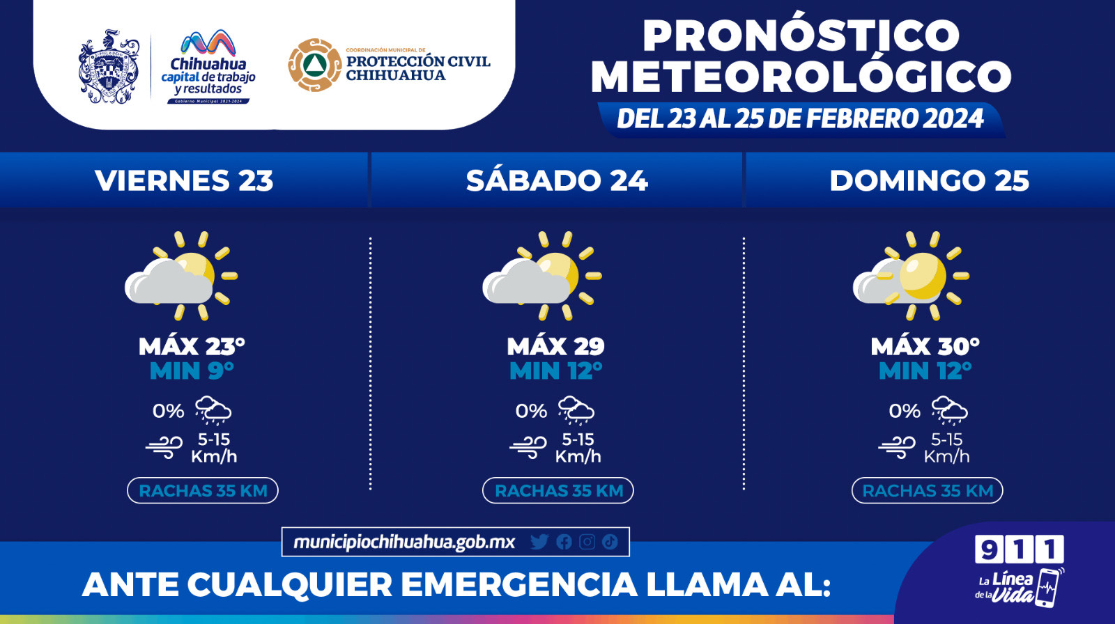 Chihuahua.- La Coordinación Municipal de Protección Civil, informa que este fin de semana, del 23 al 25 febrero, se prevén temperaturas máximas de 30°C y mínimas de 4°C.