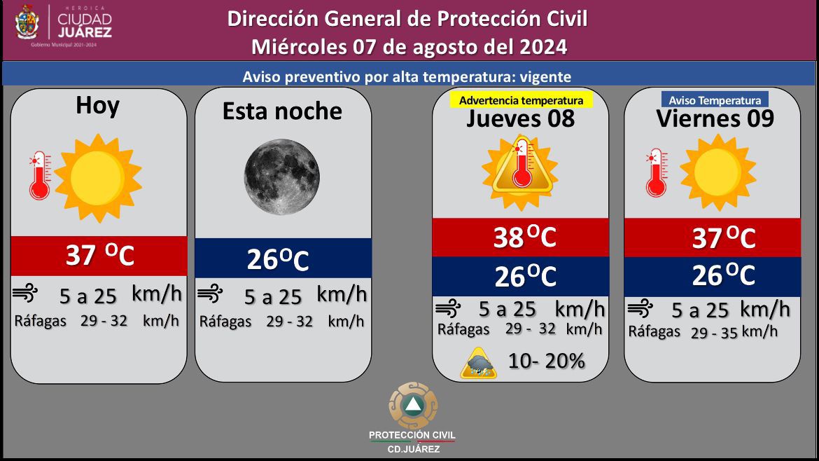 Juárez.- La Dirección de Protección Civil informa que para hoy miércoles, se espera un día soleado, con temperatura máxima de 37ºC y mínima de 26ºC.