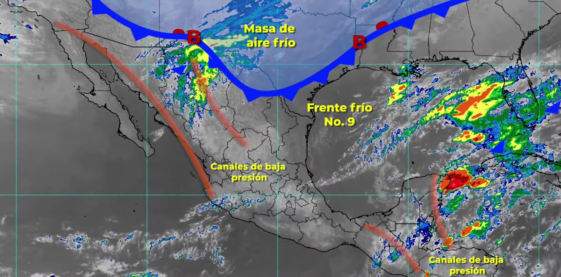 México.- Hoy, el Frente Frío Número 9 recorrerá el norte, noreste y oriente de México, por lo que se pronostican lluvias intensas en Puebla y Veracruz; fuertes en Hidalgo, Querétaro, Tamaulipas y San Luis Potosí, y chubascos en Nuevo León.