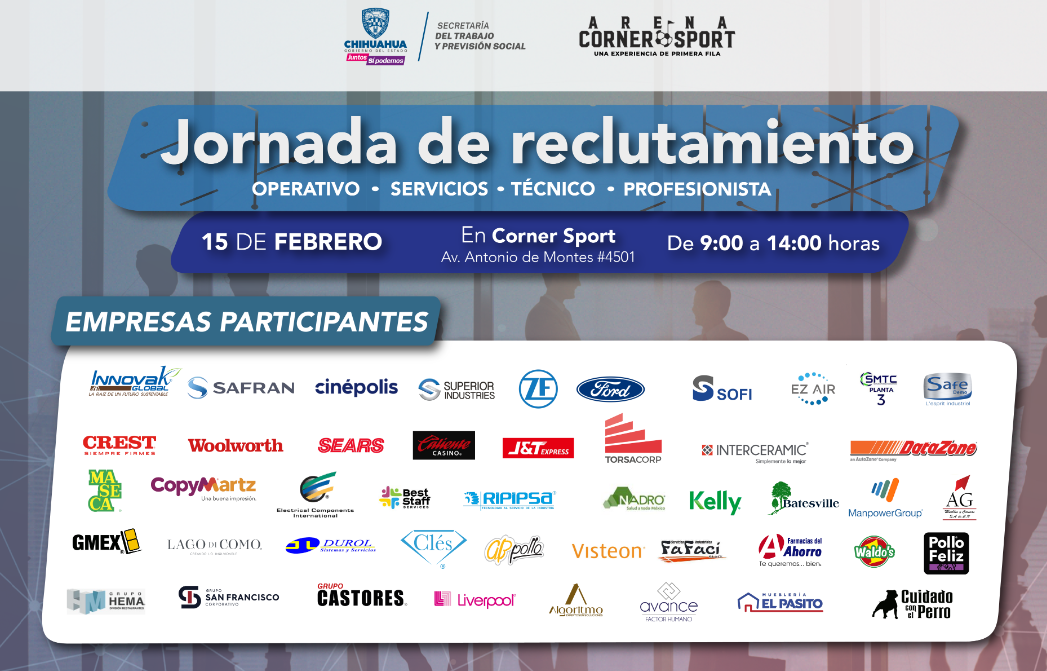 Chihuahua.- Con el objetivo de impulsar la vinculación laboral de las y los chihuahuenses, Gobierno del Estado a través de la Secretaría del Trabajo y Previsión Social, el Servicio Estatal de Empleo y en colaboración con Corner Sport, invita a participar en la próxima Jornada de Reclutamiento para nivel operativo, técnico y profesionista, que se realizará el miércoles 15 de febrero.
