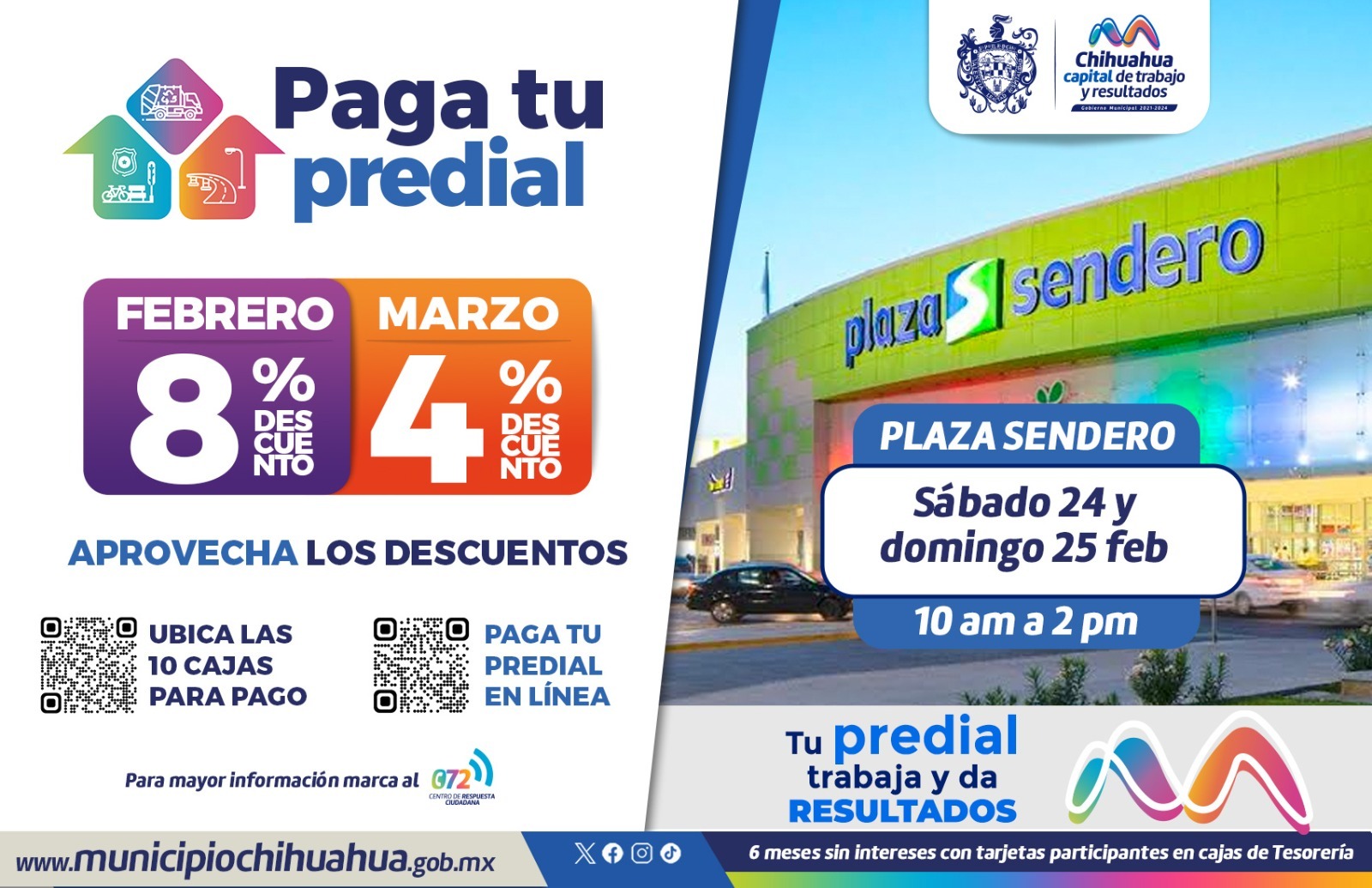 Chihuahua.- El Gobierno Municipal, a través de la Tesorería, informa a la ciudadanía que contará con un módulo de pago en la Plaza Sendero, este sábado 24 y domingo 25, de 10:00 de la mañana a 2:00 de la tarde, para que las personas que acudan aprovechen y paguen con su Predial con el 8 por ciento de descuento que se tiene en el mes de febrero.