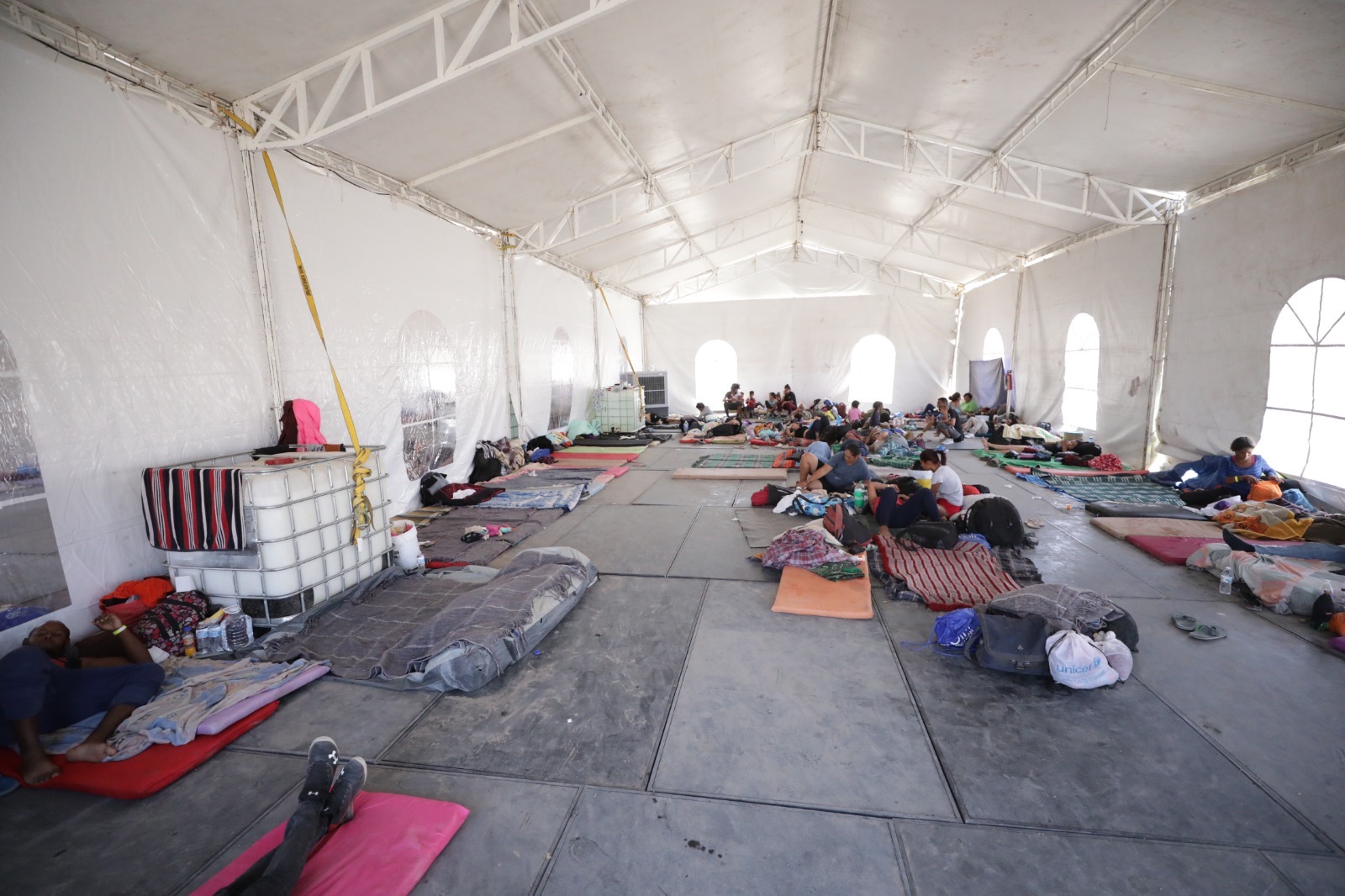 El campamento, ubicado en la calle Moctezuma y David Herrera Jordán, cuenta con dos “galerones” que ofrecen refugio a las familias migrantes. Además de un techo sobre sus cabezas, se han proporcionado colchonetas, agua, sanitarios, aire acondicionado y alimentación completa, asegurando así servicios básicos fundamentales para el bienestar de los residentes durante su estancia.