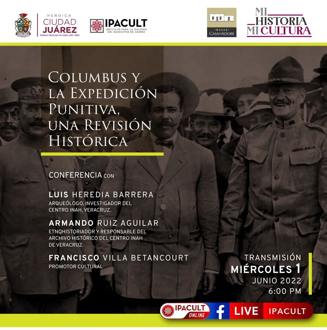 Juárez.- Organizada por personal del Museo Casa de Adobe, hoy se presentará a las 6:00 de la tarde la conferencia “Columbus y la Expedición Punitiva, una Revisión Histórica”, exposición que se hará de manera virtual a través de la página del Instituto para la Cultura del Municipio (IPACULT) en la red social Facebook.
