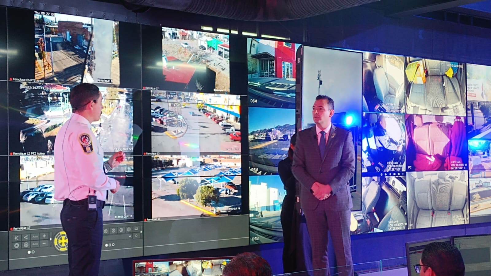 En la sala de operaciones PECUU se realizó la demostración de los alcances de las cámaras instaladas en 60 postes, 8 arcos, 28 tótems con botones de pánico, 10 remolques, un dron, 60 patrullas, más 83 cámaras fijas y 60 PTZ de la más alta tecnología.