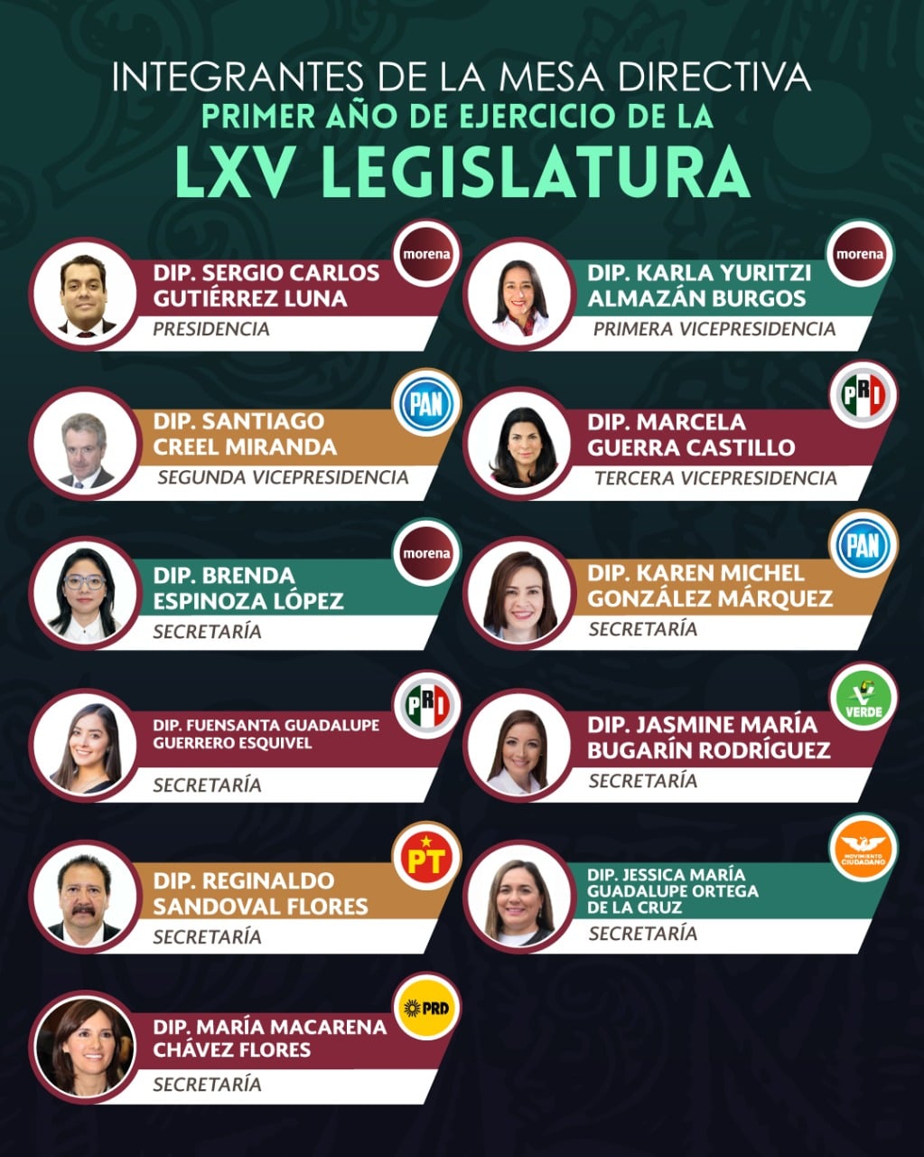 Como representas de las secretarías estarán las congresistas Brenda Espinoza López, Karen Michel González Márquez, Fuentesanta Guadalupe Guerrero Esquivel, Jasmine María Bugarín Rodríguez, Jessica María Guadalupe Ortega de la Cruz, María Macarena Chávez Flores y el diputado federal Reginaldo Sandoval Flores.