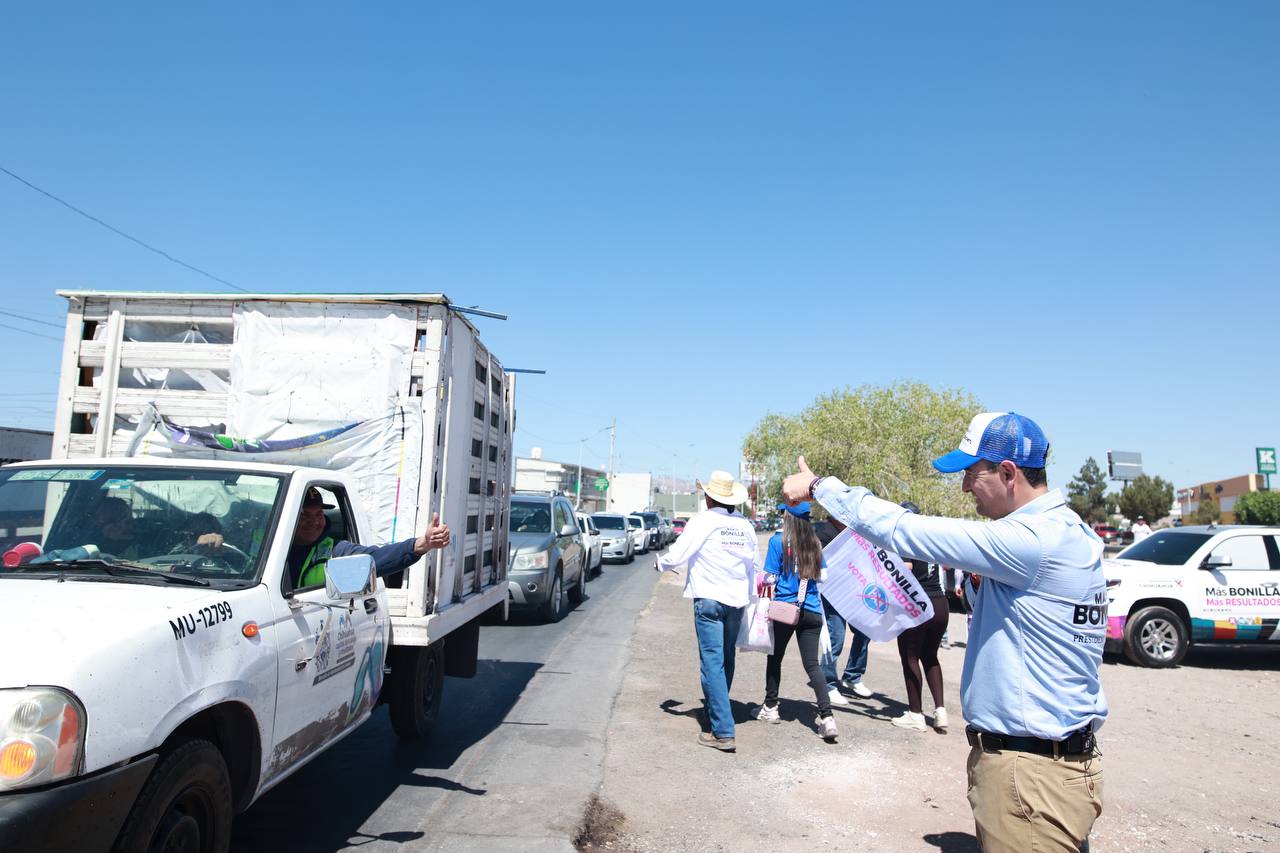 Chihuahua, Chih.- El candidato a presidente municipal por la coalición “Juntos Defendamos a Chihuahua”, Marco Bonilla, compartió sus propuestas con los conductores que transitaban por la intersección entre las avenidas Los Nogales y De las Industrias, específicamente, sobre un distribuidor vial en esta zona.