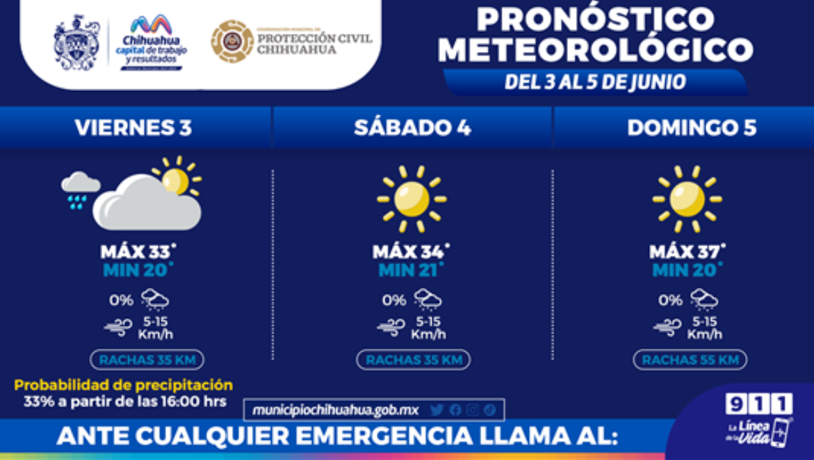 Chihuahua.- La Coordinación Municipal de Protección Civil, informa que las temperaturas para este fin de semana se esperan días calurosos, por lo cual se pide no permanecer por tiempos prolongados bajo los rayos del sol, a fin de evitar deshidrataciones u otras complicaciones de salud.