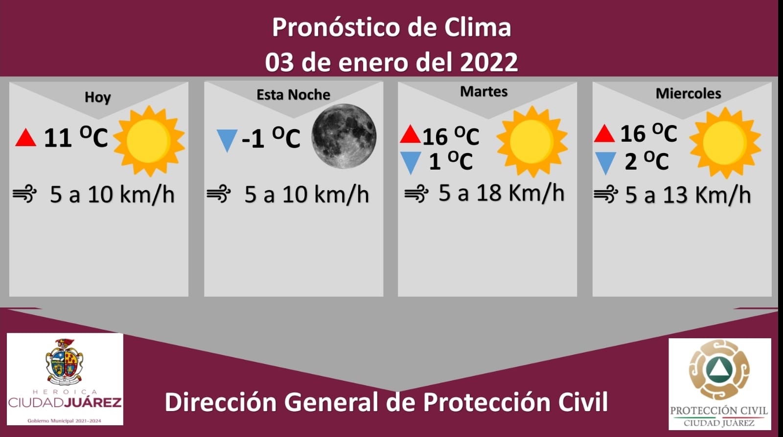 Juárez.- La Dirección de Protección Civil municipal, con base en informes del Sistema Meteorológico Nacional, pronostica una temperatura mínima de -1 grados centígrados para esta noche, en tanto que la máxima se presentará en los 11 grados celsius, dio a conocer Roberto Briones Mota, titular de la dependencia.