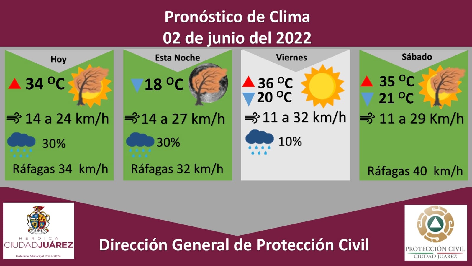 Juárez.- La Dirección General de Protección Civil del municipio, con base en informes del Servicio Meteorológico Nacional, emite una alerta verde para este jueves debido a ráfagas de viento que podrían alcanzar los 34 kilómetros por hora, además existe un 30 por ciento de probabilidad de lluvia y tormentas eléctricas, las cuales se podrían presentar después de las 5:00 de la tarde.