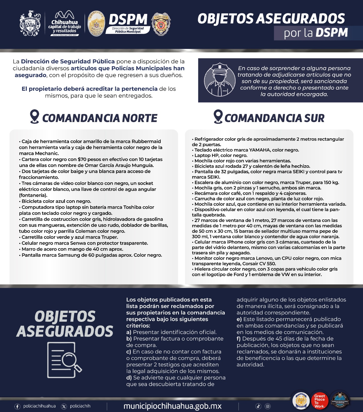 “Las personas interesadas deben acudir a las instalaciones de la Comandancia Norte, ubicada en la avenida Homero 500, en la colonia Revolución; o en la Comandancia Sur, de la avenida Pacheco 8800, en la colonia Lealtad II, en horario de lunes a viernes, de 09:00 a 15:30 horas, para cotejar los listados y determinar si se trata de artículos de su propiedad, en cuyo caso deberán cumplir con los siguientes requisitos”, agregó Diana Reyes.