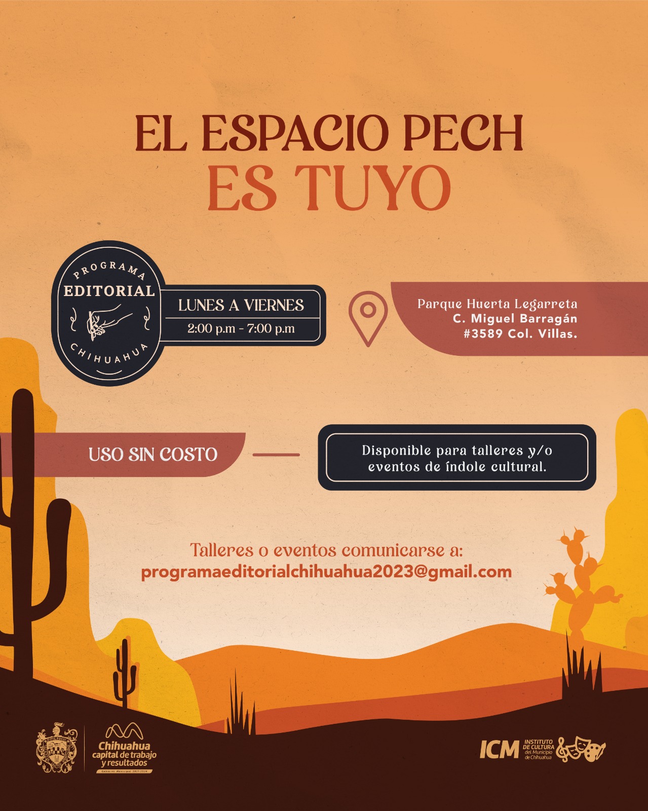 Chihuahua.- El Gobierno Municipal, a través del Instituto de Cultura del Municipio, invita a aprovechar el espacio PECH, un lugar ideal para la realización de talleres y eventos de índole cultural, el cual está disponible para dar charlas, presentaciones de libros, bazares, exposiciones, entre otras actividades.