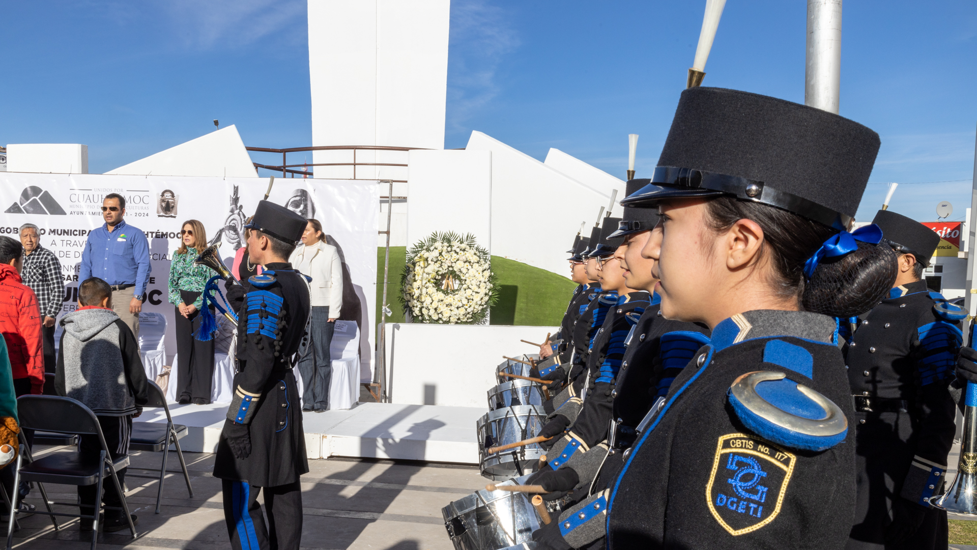 La maestra Teresa Ivonne Torres, de la primaria Cuauhtémoc ubicada en la colonia Santa María, fue la encargada de leer la reseña alusiva a la fecha, quien habló de la élite guerrera a la que perteneció Cuauhtémoc, y la defensa tenaz que hizo de Tenochtitlán, capital del imperio azteca.