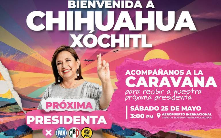 Chihuahua.- Luis Aguilar, representante de la campaña de Xóchitl Gálvez en Chihuahua dio a conocer que mañana sábado 25 de mayo a las 3 de la tarde partirá una caravana desde el Aeropuerto Internacional Roberto Fierro hasta las inmediaciones del Parque El Palomar donde los candidatos locales de la coalición PAN-PRI-PRD tendrán su cierre de campaña con la Banda El Recodo.