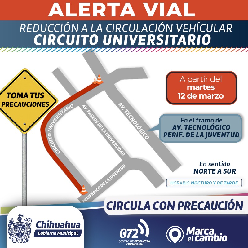Chihuahua.- El Gobierno Municipal a través de la Dirección de Obras Públicas, reitera el llamado de circular con precaución a partir de mañana 12 de marzo sobre el Circuito Universitario, desde la avenida Tecnológico al Periférico De la Juventud, debido a la aplicación de mezcla asfáltica en diversos tramos.