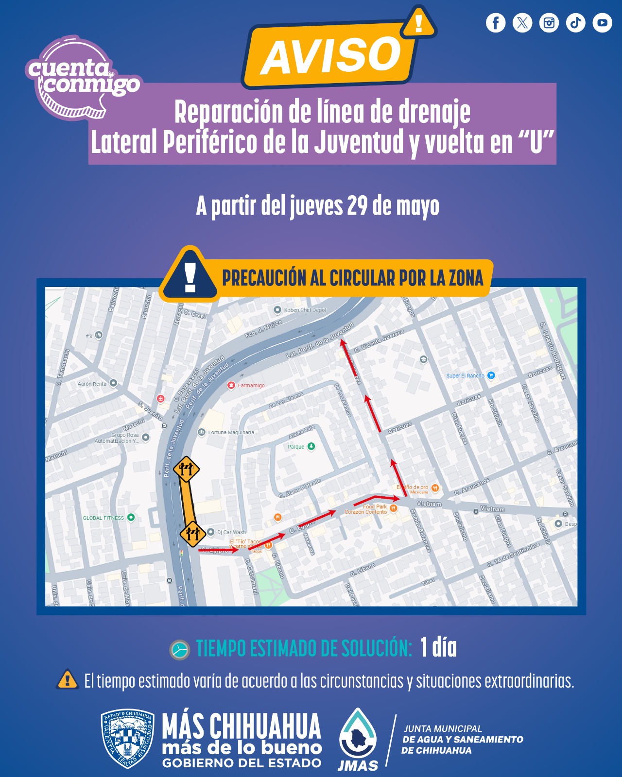 El organismo operador exhorta a los automovilistas a respetar en todo momento los señalamientos que se colocarán en la zona de trabajo, así como a conducir con precaución para evitar accidentes.