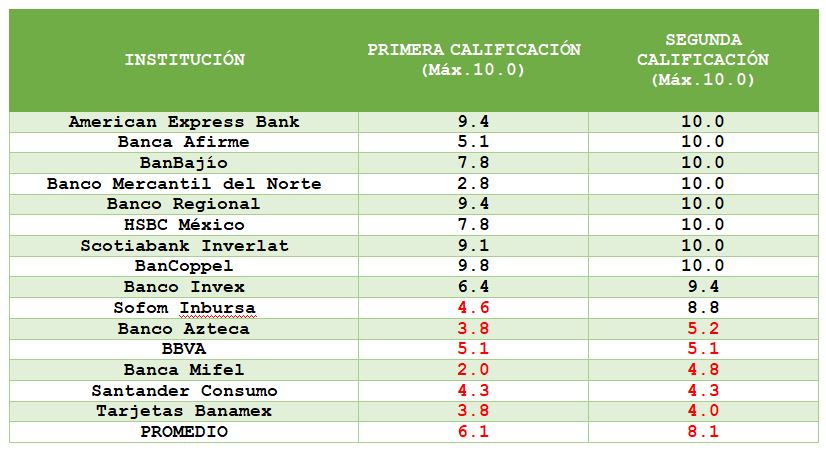 Destaca American Express Bank, Banco Regional, Scotiabank y BanCoppel que a pesar de que tuvieron muy buenas calificaciones desde la primera revisión, realizaron todos los cambios que ordenó esta Comisión Nacional y obtuvieron la máxima calificación de 10.
