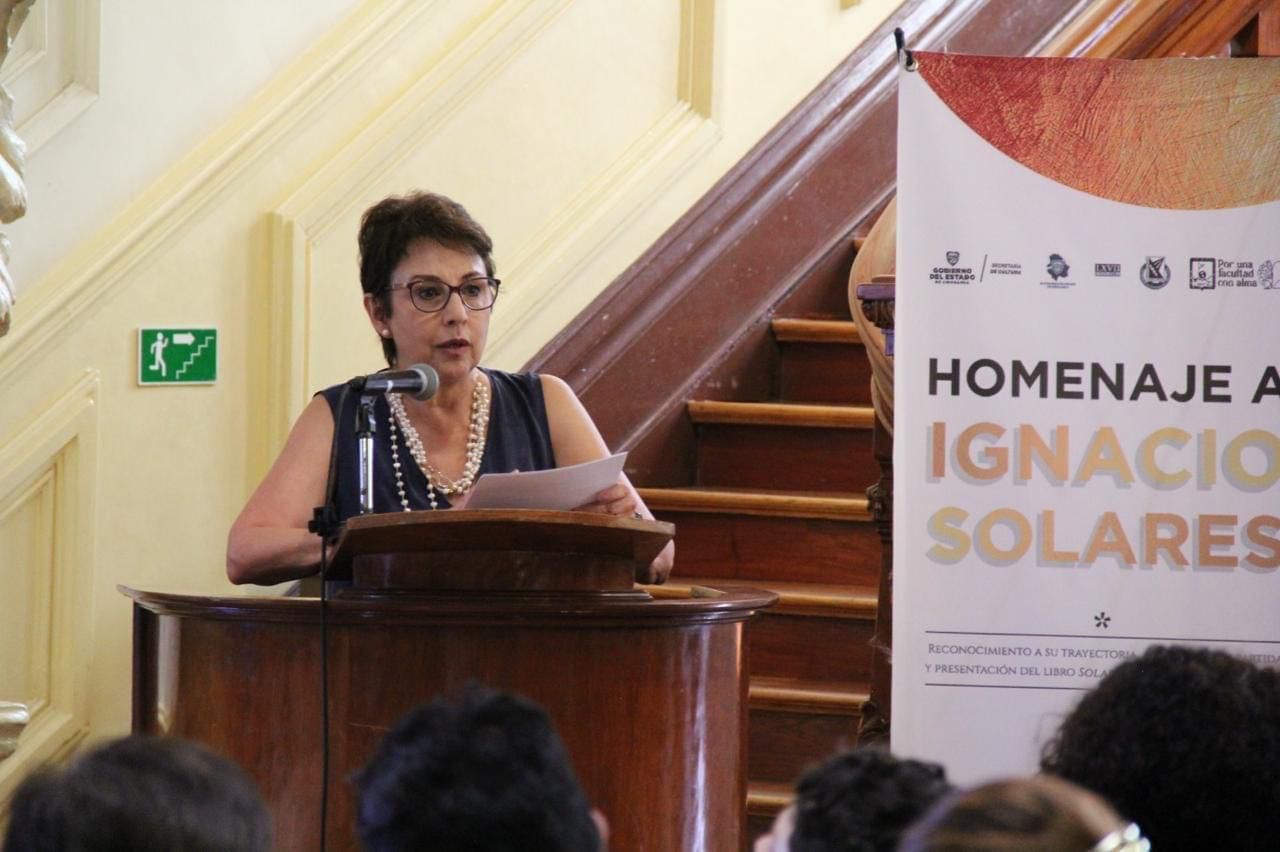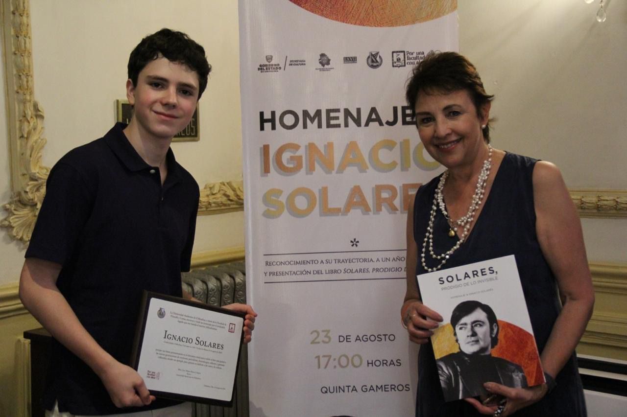 Chihuahua.- En un ambiente emotivo, celebrando la vida, obra y el importante legado que nos dejó, se llevó a cabo el homenaje al escritor chihuahuense Ignacio Solares, así como la presentación del libro “Solares, prodigio de lo invisible”. La ceremonia se realizó en el Centro Cultural Quinta Gameros y contó con la presencia de Myrna Ortega, esposa del escritor chihuahuense, así como de Pablo Solares, nieto del mismo. Asimismo, el presídium estuvo integrado por el Dr. Javier H. Contreras Orozco, Director de la Facultad de Filosofía y Letras; del Mtro. Ignacio Rodríguez Bejarano, Secretario General de la Universidad Autónoma de Chihuahua; de la C. Fernanda Bencomo, Directora del Instituto de Cultura del Municipio de Chihuahua; y de la Dip. Gabriel Ángel García Cantú, Presidente del Comité Editorial y de Bibliotecas del H. Congreso del Estado de Chihuahua.