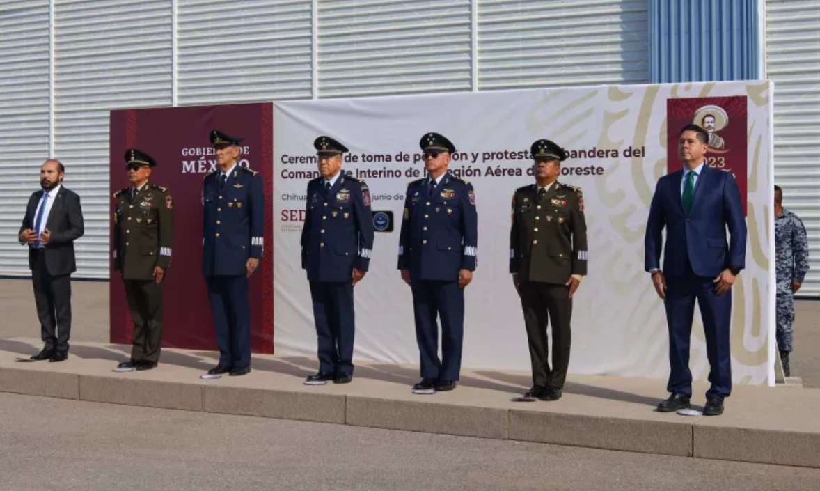 Chihuahua.- El Secretario de la Coordinación de Gabinete, Luis Serrato Castell con la presencia de autoridades civiles y militares, acudió en representación de la gobernadora Maru Campos a la toma de protesta al General de División Piloto Aviador Alfonso Rodríguez Sierra, como comandante interino de la Región Aérea Noreste.