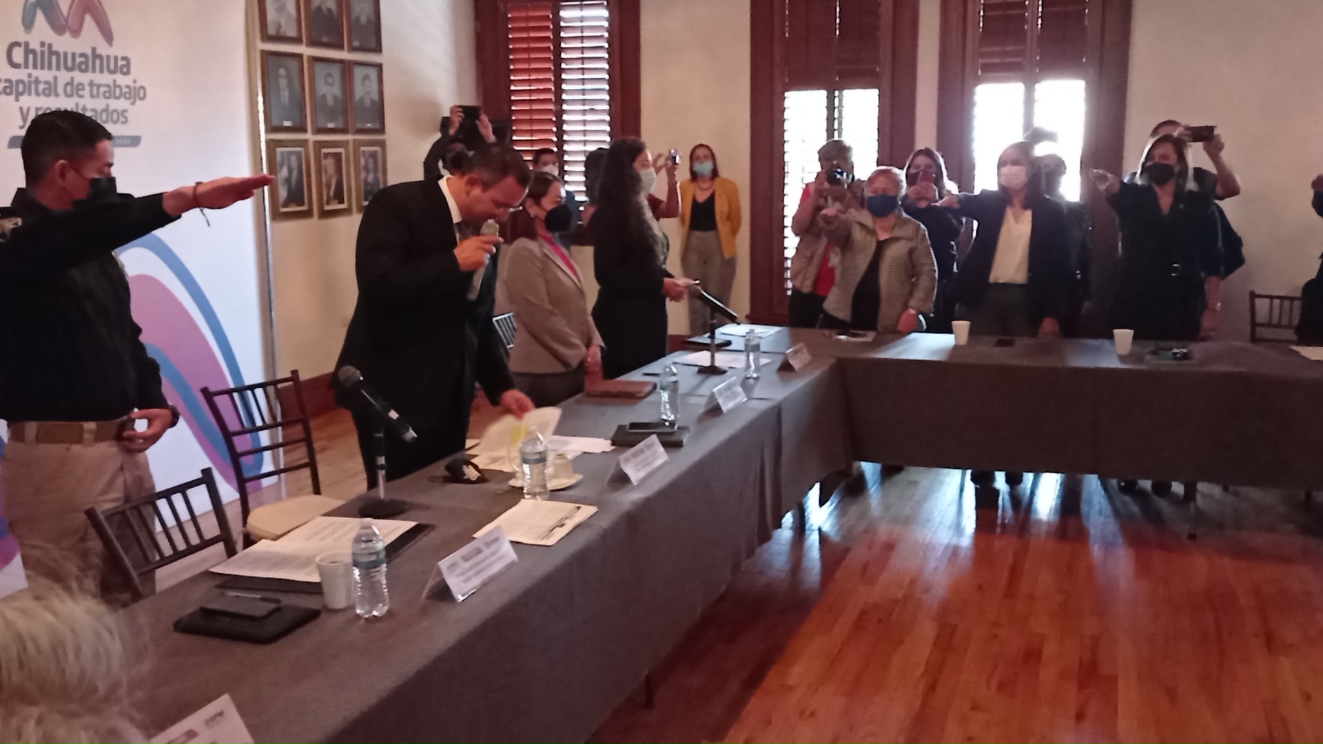 Chihuahua.- En sesión ordinaria del consejo de prevención social de la violencia y la delincuencia (COPREV), el alcalde Marco Bonilla tomó protesta al nuevo consejo de la COPREV.
