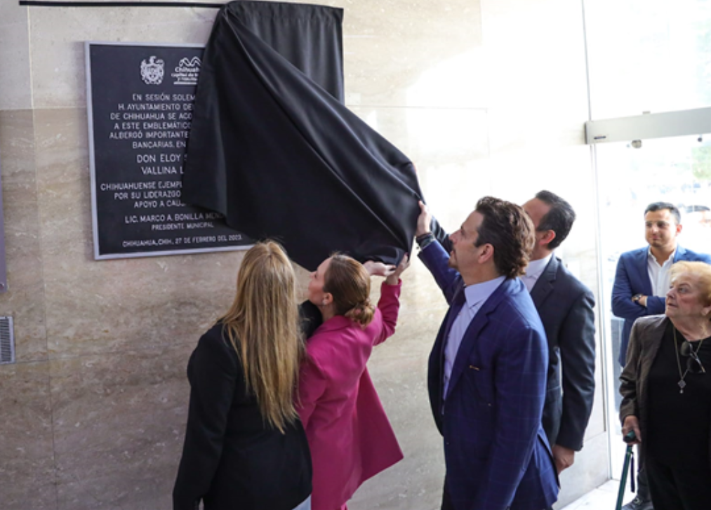 Chihuahua.- Tras la aprobación por parte de las y los regidores del H. Ayuntamiento en sesión de Cabildo del cambio de nombre del antiguo banco comercial “Comermex” a “Eloy S. Vallina Lagüera”, el alcalde Marco Bonilla, encabezó la develación de placa en homenaje al expresidente del Grupo Chihuahua.