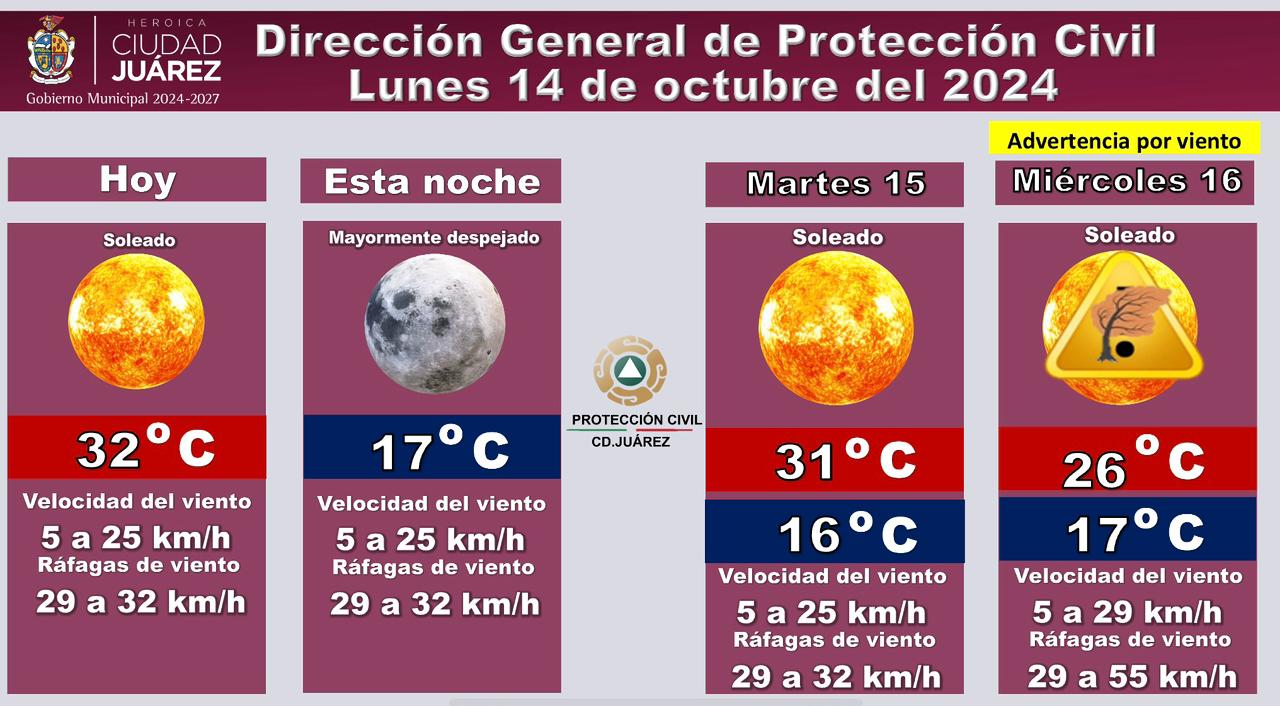Juárez.- Temperaturas cálidas y vientos moderados a fuertes para esta semana es lo que se pronostica para la frontera, según la Dirección General de Protección Civil que detalla que para este lunes se mantendrá cielo soleado con máximas de 32ºC.