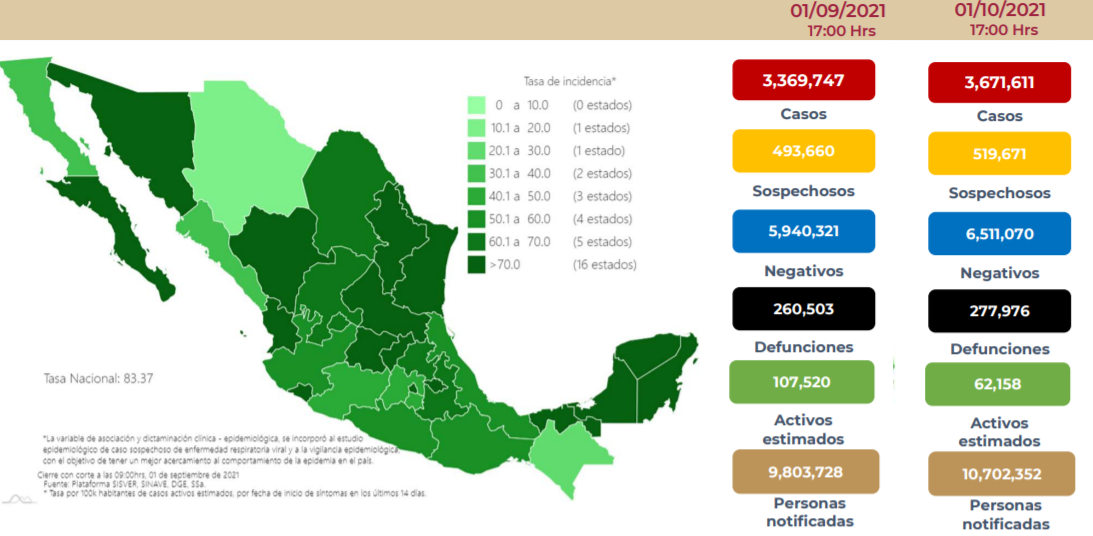 México.- Durante el mes de septiembre, 301 mil 864 mexicanos se contagiaron de Covid-19 y murieron 17 mil 473, de acuerdo con datos estadísticos que se obtuvieron del informe técnico de la Secretaría de Salud del gobierno federal, tanto del día primero del mes anterior y el de octubre, respectivamente.