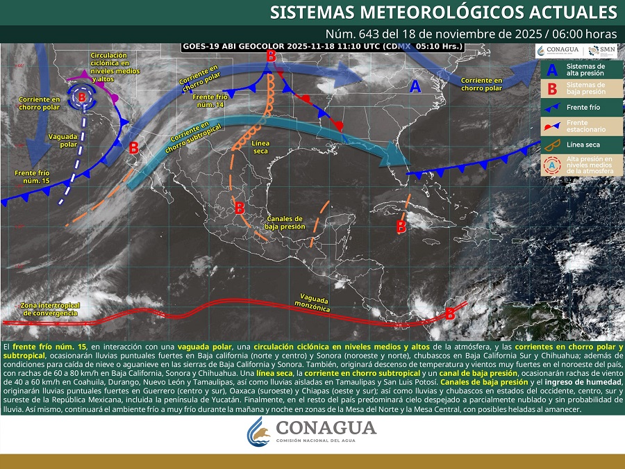 Chihuahua.- El frente frío #15 se desplazará por el noroeste del territorio nacional este martes 18 de noviembre e interactuará con una vaguada polar, una circulación ciclónica en niveles medios y altos de la atmósfera, y las corrientes en chorro polar y subtropical, factores que podrían generar chubascos en la entidad, informó el Servicio Meteorológico Nacional (SMN).
