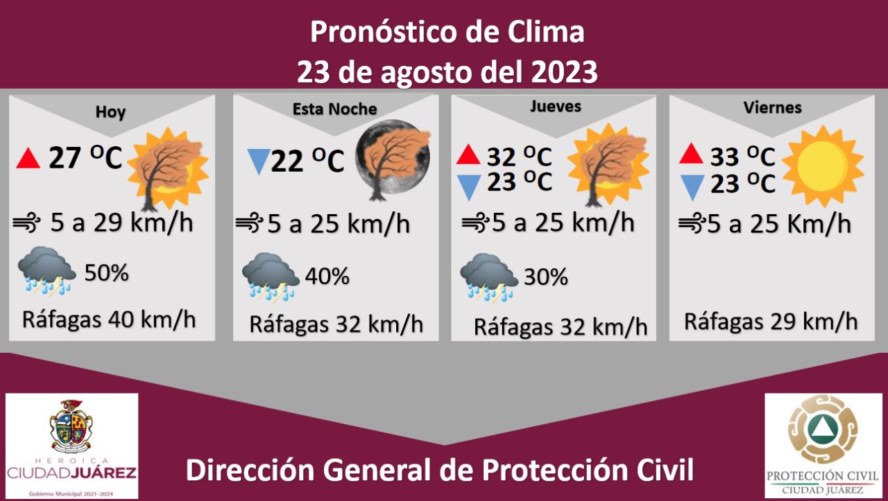 Juárez.- La Dirección General de Protección Civil, con base en informes del Servicio Meteorológico Nacional, pronostica un 50 por ciento de probabilidad de lluvia y tormentas eléctricas para este miércoles, la cual estará acompañada de ráfagas de viento de hasta 40 kilómetros por hora, informó Roberto Briones Mota, titular de la dependencia.