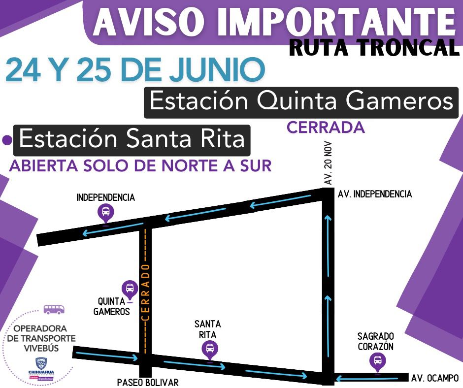 Las unidades de transporte de la Operadora de Transporte Vivebús (OTV) serán desviadas desde la avenida Ocampo y 20 de Noviembre, por lo que se recomienda a los usuarios que se dirigen hacía zona centro utilizar la estación Sagrado Corazón para bajar, o bien, continuar el recorrido por la propia 20 de Noviembre hasta la avenida Independencia, en donde las unidades retomarán la ruta y permitirán el descenso en estación Independencia.