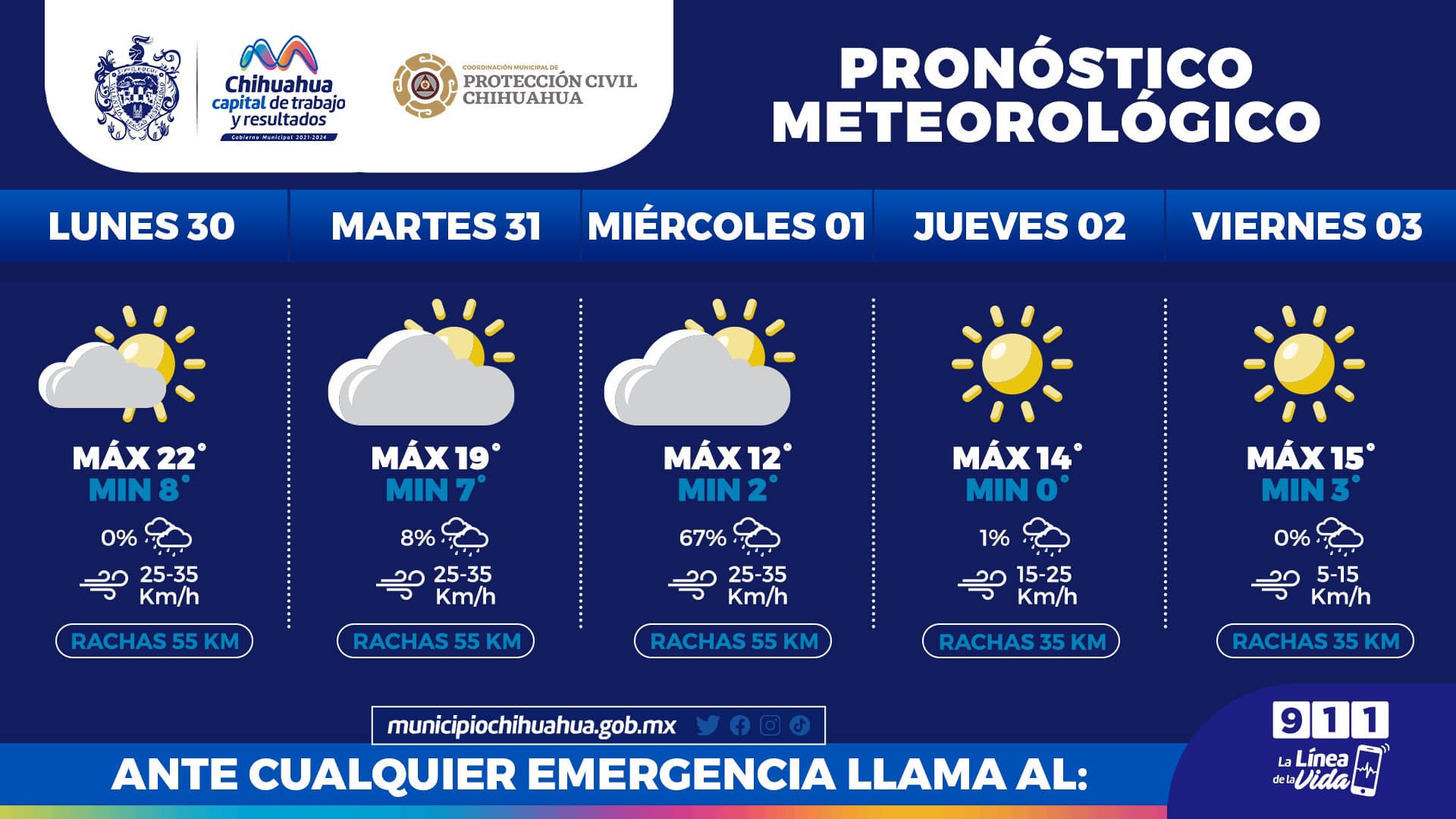De acuerdo al pronóstico que emite el Servicio Meteorológico Nacional de CONAGUA, para este lunes 30 de enero, se espera una temperatura máxima de 22°C y una mínima de 8°C con vientos de hasta 55 kilómetros por hora, con un cielo parcialmente nublado; para el martes 31, una máxima de 19°C y mínima de 7°C con vientos de hasta 55 kilómetros por hora, con un cielo nublado y 8 por ciento de probabilidad de lluvia.