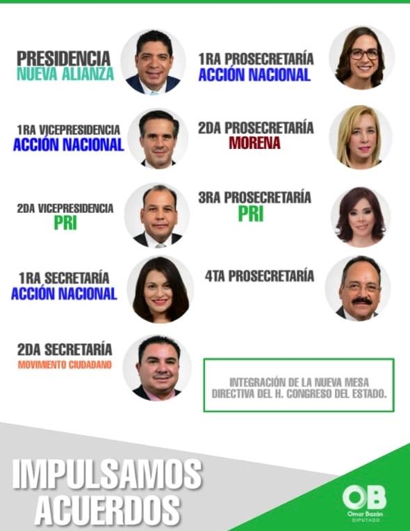 Como prosecretario Marisela Terrazas del PAN, segunda prosecretaria Ana Estrada de Morena, Ana Elizabeth Chávez Mata como tercera prosecretaria y Obed Lara Chávez del PES como cuarto prosecretario.