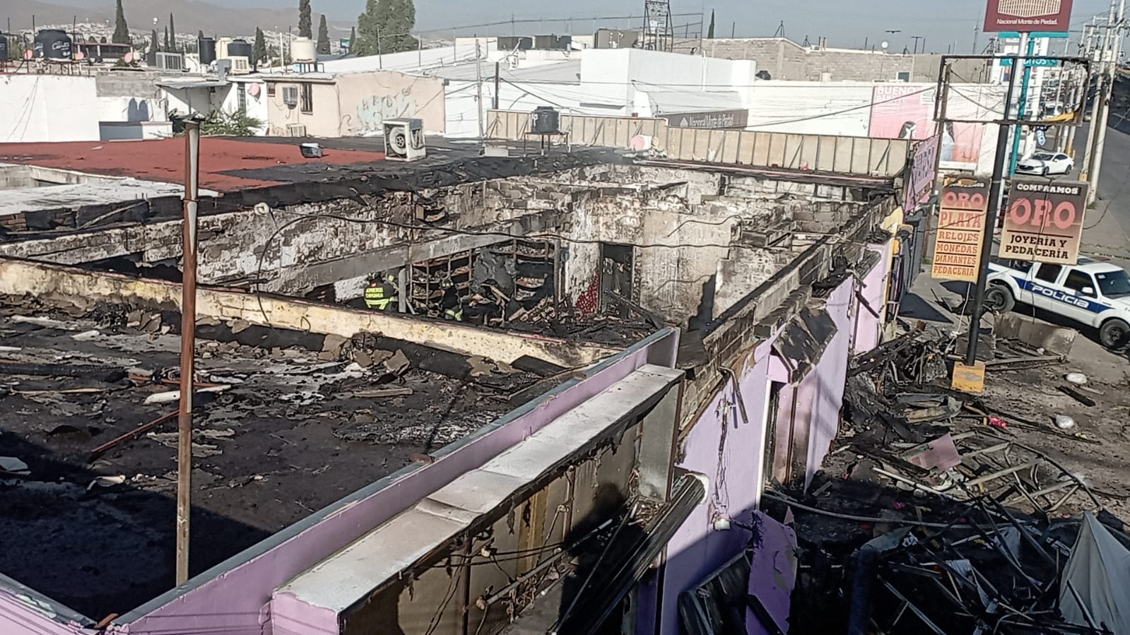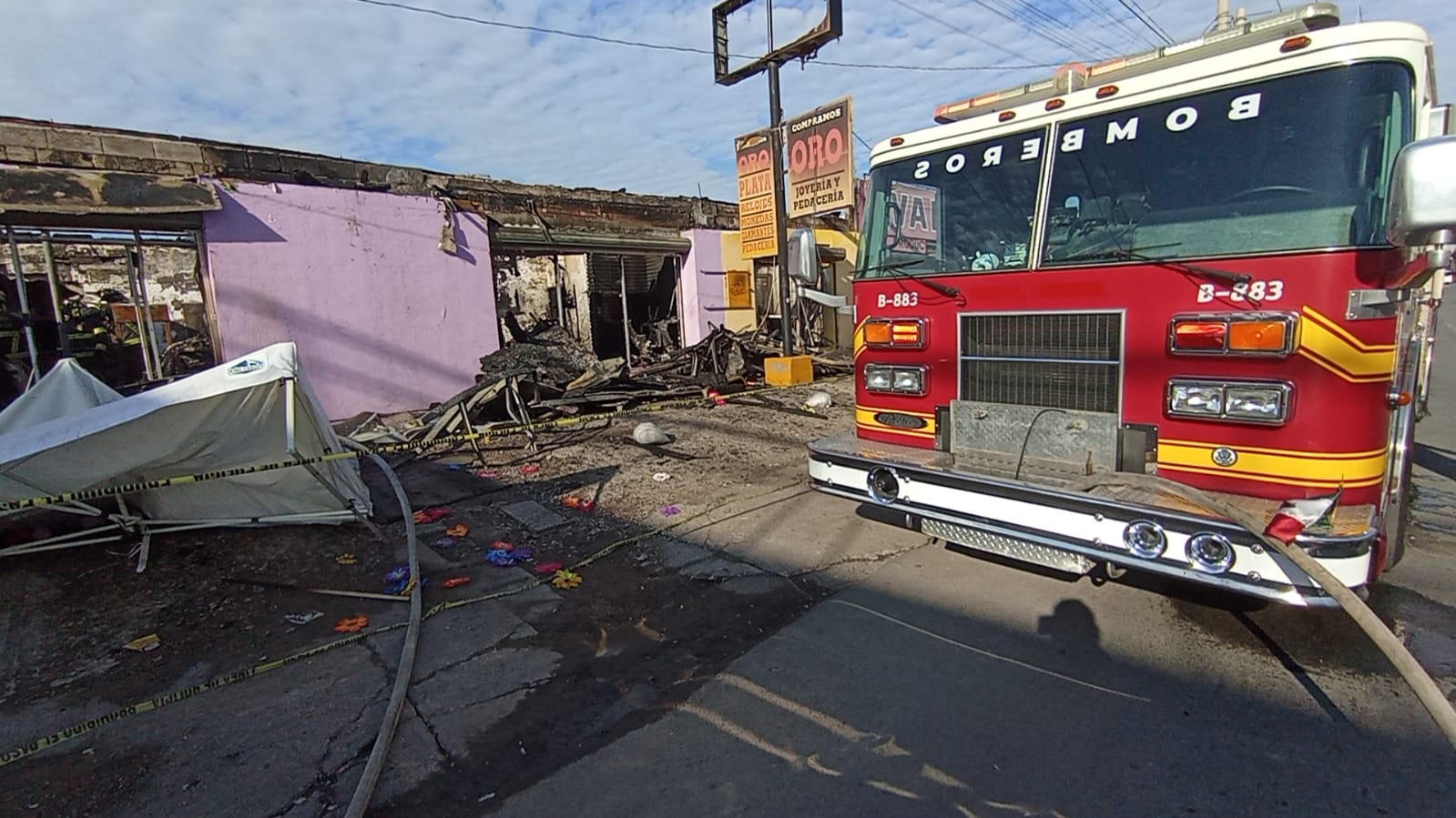 Chihuahua.- Elementos del cuerpo de Bomberos y policías municipales llegaron nuevamente a los locales incendiados la noche de ayer en la avenida Tecnológico, justo enfrente de la iglesia de la Divina Providencia.